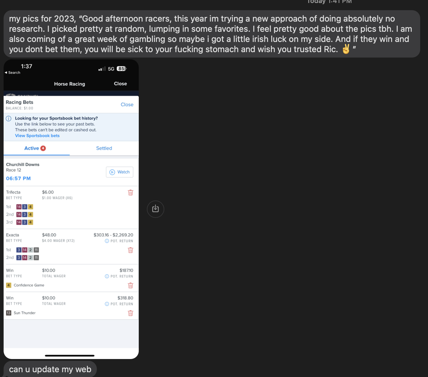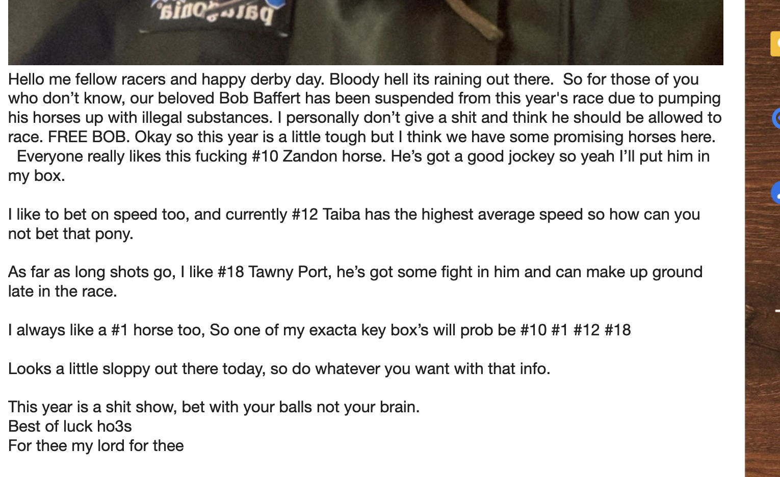 Good day racers! I completely forgot today was the derby until I woke up. Let’s get right to it. I don’t know much about these horses, but what I do know if that I’m betting the house on my dog Bob Baf. That’s right, everyone’s favorite silver fox horse doper is back. With a horse named Citizen Bull at 13/1 right now. How could you not bet? You kidding me??
