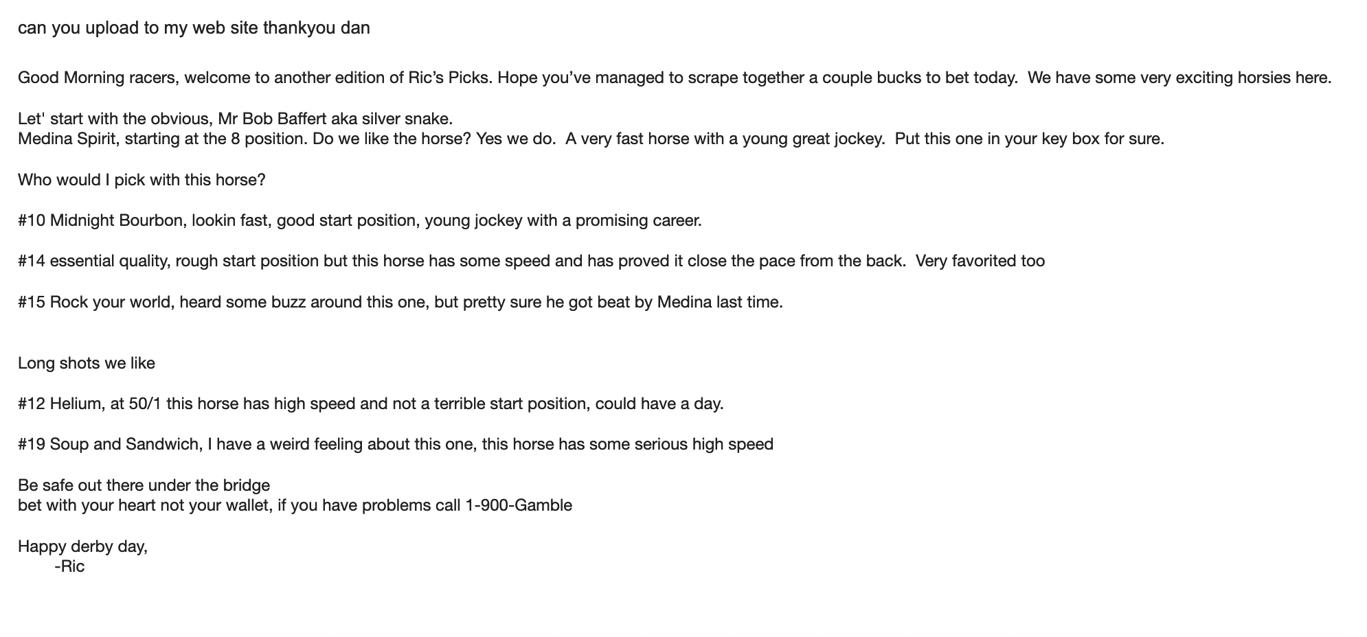 Okay that’s it for today, best of luck everyone. Now take your mint julep, raise it to the horizon, and thank god you’re alive on this cloudy but beautiful race day!